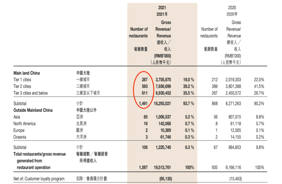 年报显示,2020年,海底捞门店在一、二线和三线及以下城市的新增门店数量分别为:65家、167家、257家。