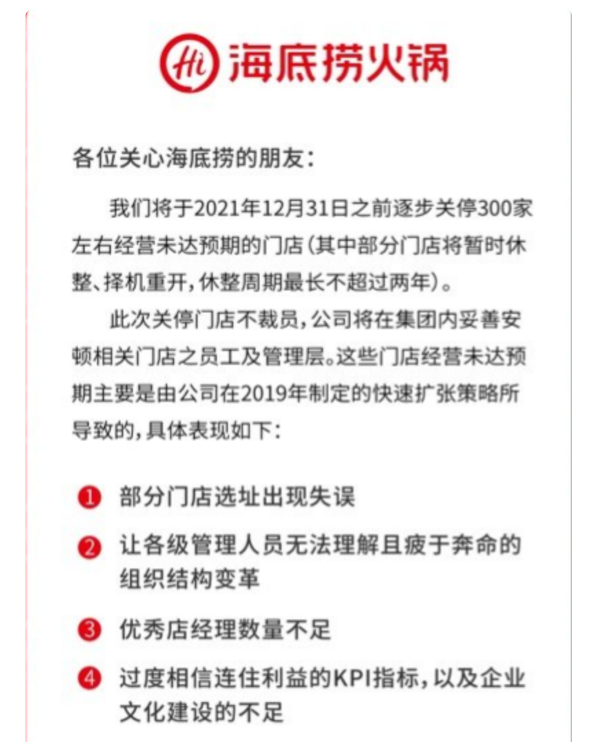 继去年11月传出关停300家门店的消息后,海底捞日前又有坏消息传来。