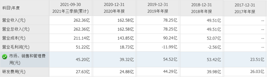 蔚来汽车2017年-2021年Q3研发费用(数据来源:同花顺)