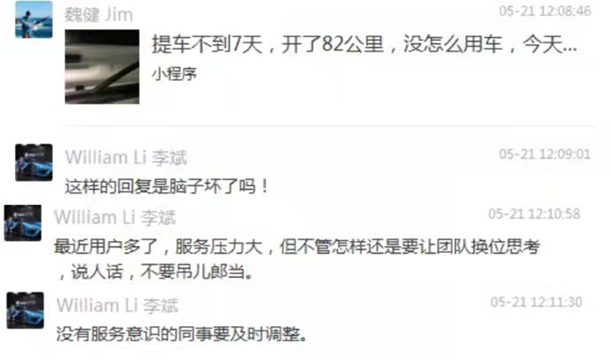 李斌看到这个帖子后,不到15秒,就在群里回复到,“这样的回复是脑子坏了吗!最近用户多了,服务压力大,但不管怎样还是要让团队换位思考,说人话,不要吊儿郎当。”同时指出,要让“没有服务意识的同事及时调整。从招聘、培训、管理各方面理一下,系统避免出现这样的事。”