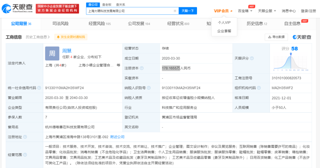 天眼查官网显示,淂意品牌归属上海大喂科技发展有限公司,公司成立于2020年3月,注册资本约178万元,法定代表人为周慧,企业曾用名杭州德唯善在科技发展有限公司,经营范围包括互联网销售、化妆品零售、化妆品批发、卫生洁具销售、个人卫生用品销售、工艺美术品及收藏品零售、日用百货销售、化工产品销售等。