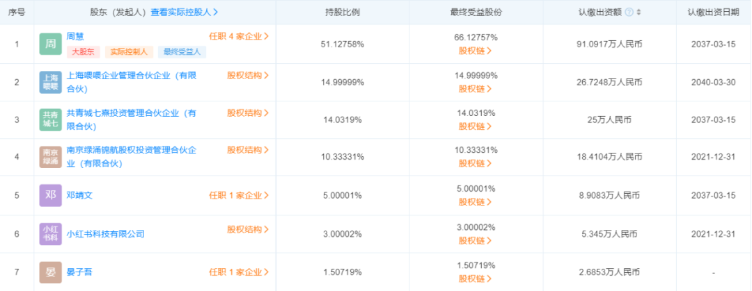 股东信息显示,公司法定代表人及董事长周慧持股比例约51%,由周慧担任董事长的上海喂喂企业管理合伙企业(有限合伙)持股约15%,种子轮融资投资方七熹投资持股约14%,华创资本旗下南京绿涌锦航股权投资管理合伙企业持股约10%,而小红书科技有限公司仅持股约3%。
