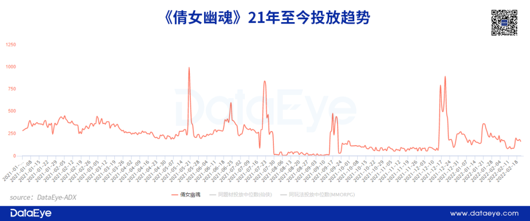 从投放趋势来看:节约投放成本,进行针对性投放。《倩女幽魂》并不是在全年保持较高的投放强度,而是进行针对性投放。根据DataEye-ADX显示,《倩女幽魂》21年投放峰值恰逢“520情人节”当天,突出关键节点投放的重要性,还有在圣诞节前夕,配合产品版本更新加大投放。