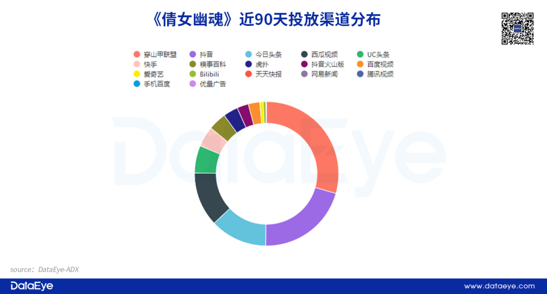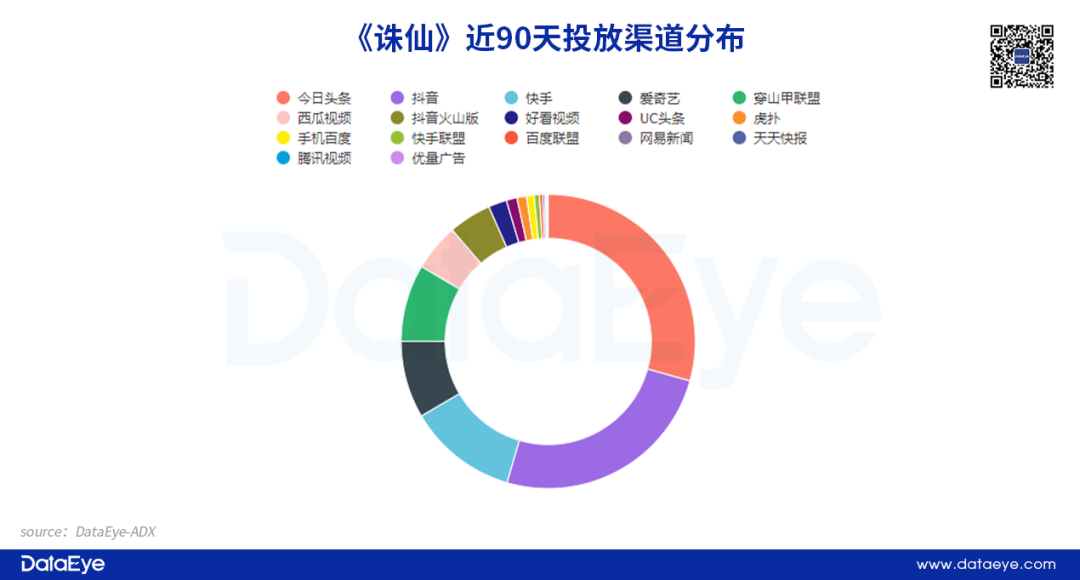 以投放量偏低的《诛仙》为例,虽然投放总量不高,但近90天内投放渠道高达17个,而且分布均匀,以字节系为主,同时覆盖到快手、百度、腾讯系等多个渠道。而投放力度较大的《倩女幽魂》同样如此,以字节系为主要投放渠道,同时覆盖虎扑、BiliBili等用户属性较强的渠道,试图形成破圈。