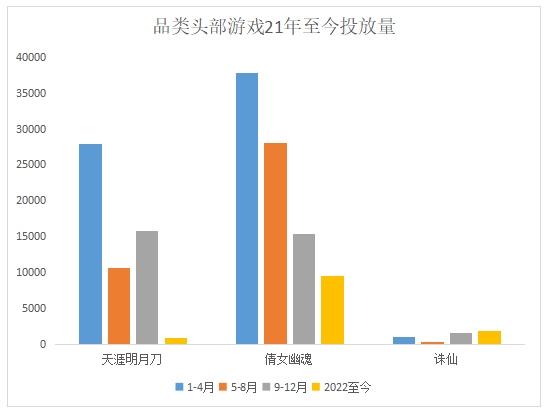 《倩女幽魂》整体投放力度强势,日均投放量约为310余组,同时保持贯穿全年的效果广告投放,保证宣传力度和产品热度。同样是16年上线的产品,完美《诛仙》在投放力度上差别明显,21全年投放总量仅为2800余组。