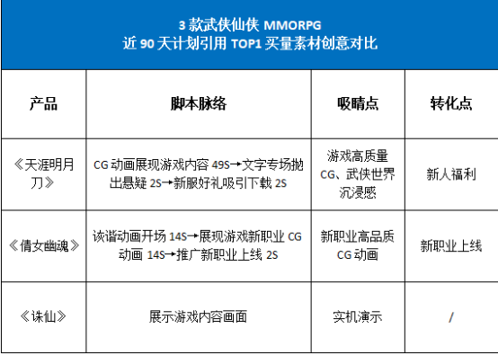 从创意素材来看:厂商期望打造沉浸式的武侠仙侠世界。通过DataEye研究院对头部产品近90天计划引用数TOP1的创意素材进行分析,发现厂商多以打造沉浸式武侠仙侠世界为主要的创意核心。