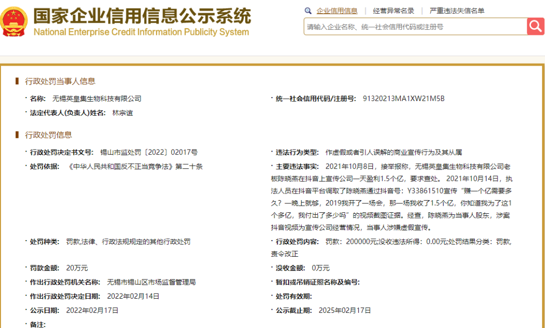 根据处罚内容显示,2021年10月8日,无锡市锡山区市场监督管理接举报称,无锡英皇集生物科技有限公司老板陈晓燕在抖音上宣传公司一天盈利1.5个亿,要求查处。