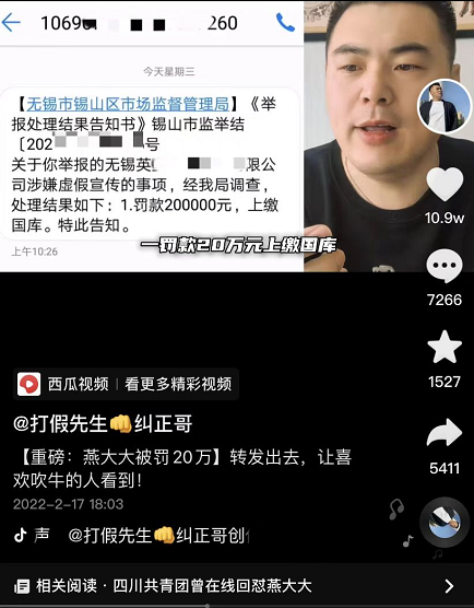 据悉,去年10月,“燕大大”在抖音上宣传“2019年一场会,收了1.5个亿”后,“纠正哥”查询了“燕大大”的公司,发现其为英皇集公司创始人。同时,他还发现该公司只给19个人交了社保,缴税共5000元,涉嫌偷税漏税。由此,“纠正哥”向无锡税务局和工商管理局进行了举报。