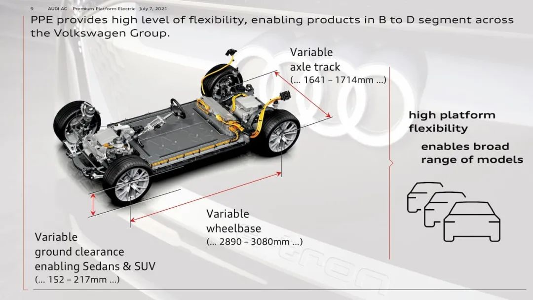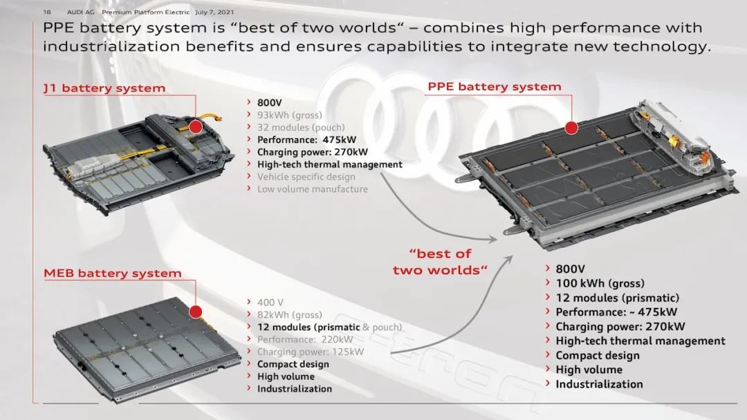 PPE则是大众集团的高端纯电平台,由奥迪和保时捷合作开发,主要用于奥迪、保时捷乃至宾利等大众集团高端品牌电气化转型。关于PPE平台的发展规划,大众集团提到了三个指标:加速更快、续航更长、充电时间更短。