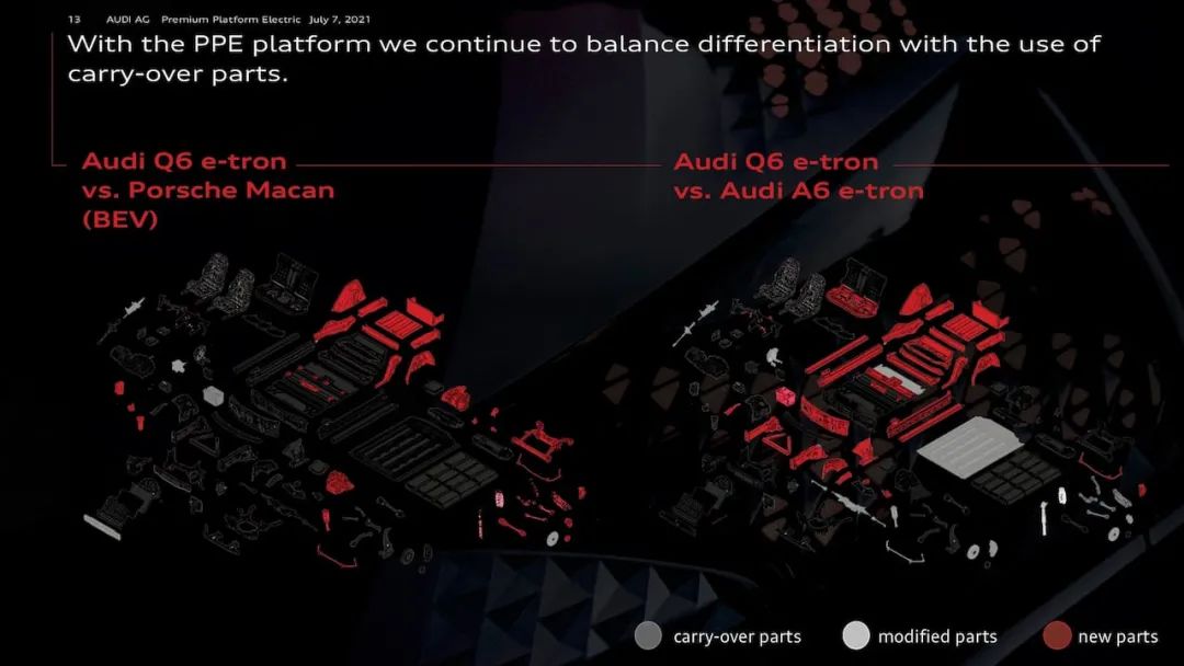 去年的大众电池日上,大众集团预告了PPE平台首款产品的落地时间是2022年,在奥迪A6 e-tron之后,这个平台还会诞生Q6 e-tron和保时捷Macan EV。从集团内部的产品规划来看,PPE平台主要用于高端产品线的电气化转型,涵盖了B级到D级产品;而从奥迪的发展时间来看,PPE平台才算是真正让其具备竞争力的2.0时代。