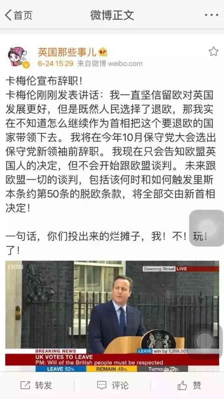 国内网友抱着“看热闹不嫌事大”的心态,在社交网站开始了吐槽。这是卡梅伦宣布辞职以后: