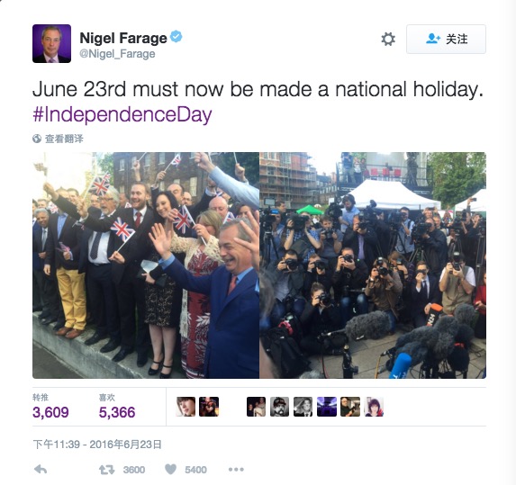 英国独立党主席Nigel Farage在此次脱欧行动中发挥了举足轻重的作用,他称今天是英国另一个“独立日”。