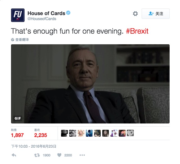 美剧《纸牌屋》的官方推特账户发推文称“今晚如此欢乐。”