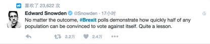 斯诺登在推特上发声说:“无论英国脱欧的结果是什么,都已经表明一个国家能以多快速度最终让一半人口改投反方。这是一个教训!”