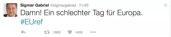 各界名人也对此作出了反应。德国副总理Sigmar Gabriel在推特上发飙,“该死,真是糟糕的一天!”