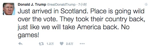 刚刚到达苏格兰的特朗普发推特:“我刚到苏格兰。这个地方看到公投结果都乐疯了。他们夺回了自己的国家,我们也会夺回自己的美国!”网友转发提醒:呃,特朗普先生,其实苏格兰是留欧派的。”