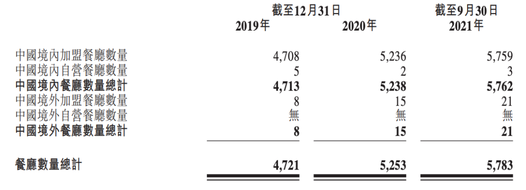 招股书显示:截至2021年9月30日,杨国福麻辣烫的自营餐厅仅有3家,加盟餐厅则有5780家(5759家在境内,21家在境外)。