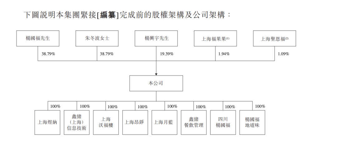 引入公众股东前的公司股权架构:朱冬波为杨国福妻子,杨兴宇为杨国福和朱冬波的儿子