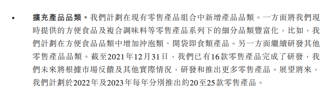 截至2021年,杨国福麻辣烫已经完成16种零售产品的研发,其在招股书中表示,将于2022年及2023年每年分別推出约20至25款零售产品。