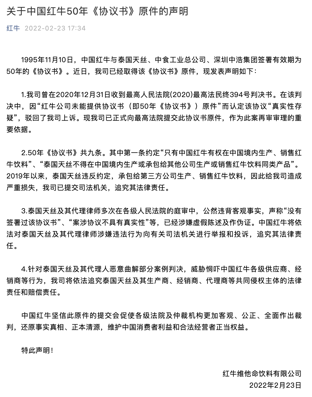 2月23日,红牛维他命饮料有限公司发布声明称,1995年11月10日,中国红牛与泰国天丝、中食工业总公司、深圳中浩集团签署有效期为50年的《协议书》。近日,公司已经取得该《协议书》原件。公司曾在2020年12月31日收到最高人民法院(2020)最高法民终394号判决书。在该判决中,因“红牛公司未能提供协议书(即50年《协议书》)原件”而认定该协议“真实性存疑”,驳回了公司上诉。现公司已正式向最高法院提交此协议书原件,作为此案再审审理的重要依据。