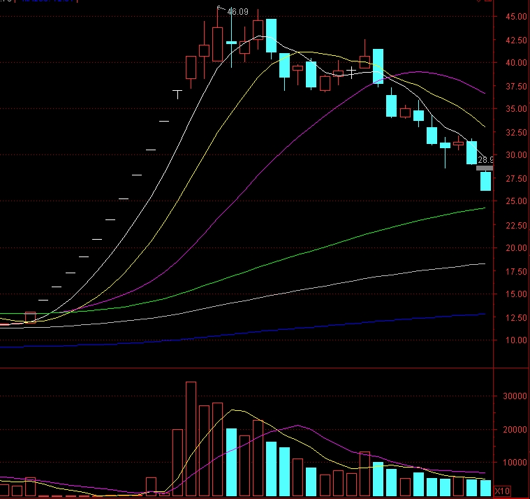 5月11日复牌后,伴着牛市补涨,徐翔主导重组的消息让康强电子股价从12元左右连续12个涨停,并在顶部放量后稳定在40元左右。