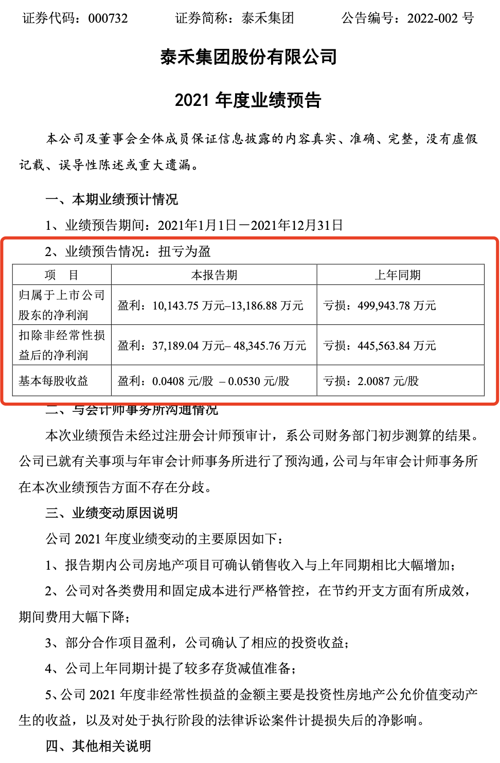 对于这波反弹,从公开信息来看,泰禾在年前发布过一份业绩预告,称得益于项目结转情况较好,以及严格管控费用成本、上年计提了较多存货减值准备等,2021年有望继连续两年亏损后,实现扭亏为盈。