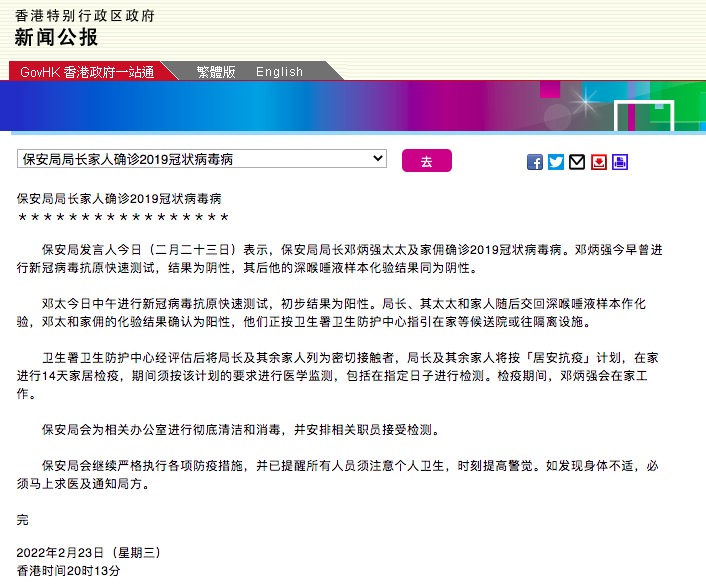 据香港特区政府新闻公报,香港保安局发言人2月23日表示,保安局局长邓炳强太太及家佣确诊新冠。邓炳强今早曾进行新冠病毒抗原快速测试,结果为阴性,其后他的深喉唾液样本化验结果同为阴性。