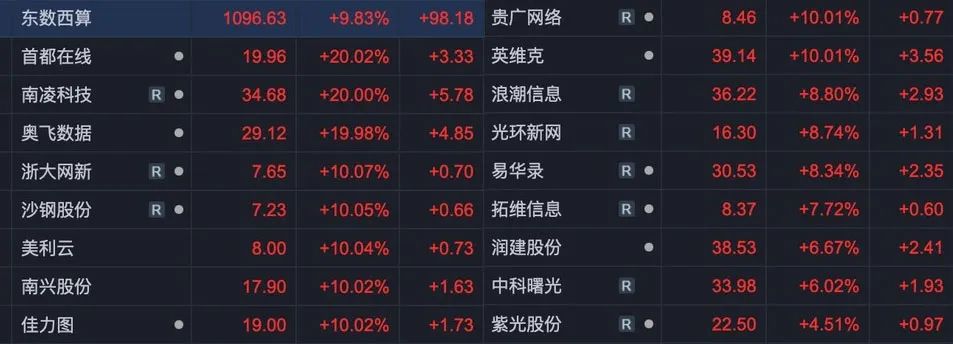 从近日热火的“东数西算”概念股我们都能看到,大多数都是涨停态势。除了我们提到的这几家服务器、机房等主要基础设施供应商,还有多家智东西长期关注的存储、光模块等细分领域玩家也迅速冲到人们的视野中。