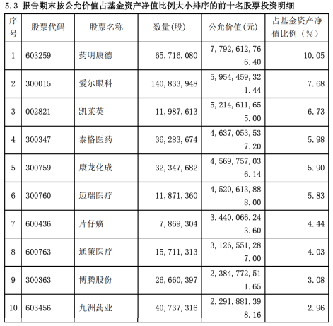 截至2021年四季度末,葛兰的基金中欧医疗健康混合A、C前十大重仓股分别为药明康德(603259.SH)、爱尔眼科(300015.SZ)、凯莱英(002821.SZ)、泰格医药(300347.SZ)、康龙化成(300759.SZ)、迈瑞医疗(300760.SZ)、片仔癀(600436.SH)、通策医疗(600763.SH)、博腾股份(300363.SZ)、九洲药业(303456.SH),合计持股市值439.32亿元。