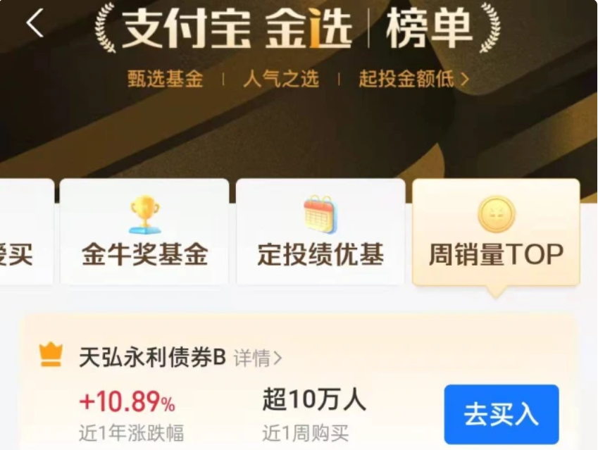 耐人寻味的是,当葛兰基金被除名的当周,在支付宝的基金周排行榜中,排名首位基金为天弘永利债B,这是一只二级债基,该基金近一年上涨11.37%,近一周超10万人购买。该基金的管理人为天弘基金,其大股东为蚂蚁集团。