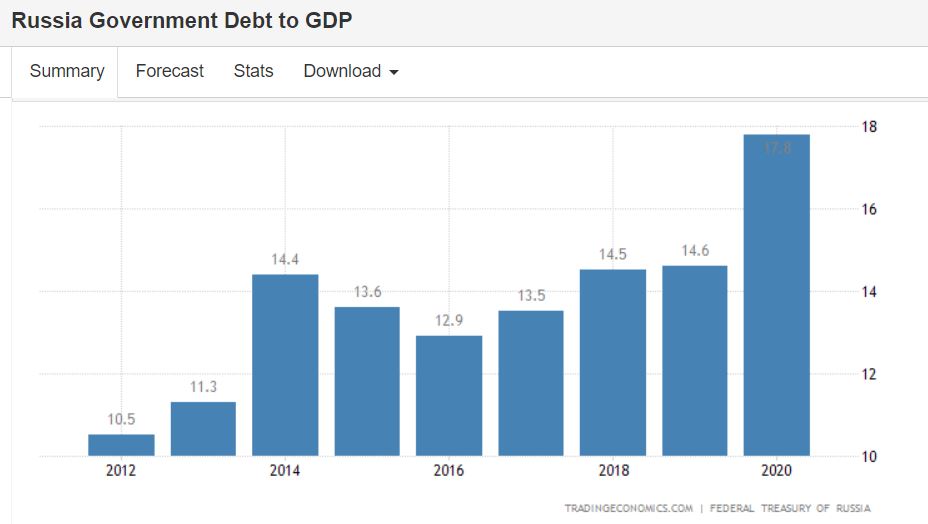 为了随时准备应对新冲击,俄罗斯多年来奉行保守的财政政策、控制政府债务水平。从2015年到新冠疫情前,俄罗斯的政府债务占GDP比重保持在13%到15%,2020年疫情期间才升至17.8%的新高峰。