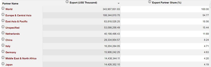 世界银行WITS数据库统计显示,2015年,俄罗斯出口的主要目的地是欧洲和中亚,该地区占俄对全球出口额的54.77%,东亚和太平洋地区占18.56%。各国中,荷兰是俄罗斯最大出口目的地,其次为中国、意大利、德国和日本。