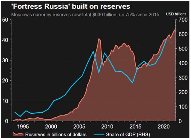俄罗斯财长西卢安诺夫上周表示,虽然西方国家可能对俄罗斯银行采取的制裁将造成市场动荡,但由于国际储备充足,俄罗斯能够确保银行系统的安全。有需要时,国际储备也能用于支持卢布汇率、解决政府开销。