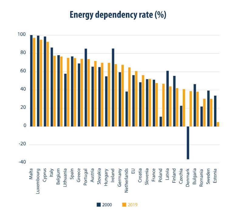 欧盟对进口能源的依赖度升至61%,也就是所需能源超过一半都依赖进口,高于2000年的56%。各国中,马耳他对进口能源的依赖度最高,超过90%。