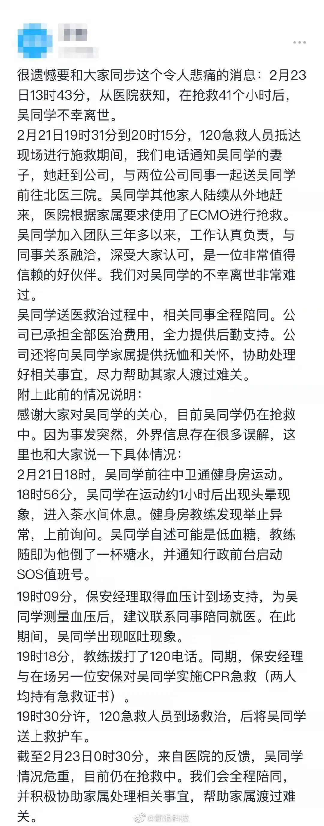 根据字节跳动内网信息,吴同学在2月21日18点前往中卫通健身房运动。在运动约1小时后出现头晕现象,进入茶水间休息。健身房教练发现其举止异常后紧急处理,并叫来两名保安人员实施CPR急救。