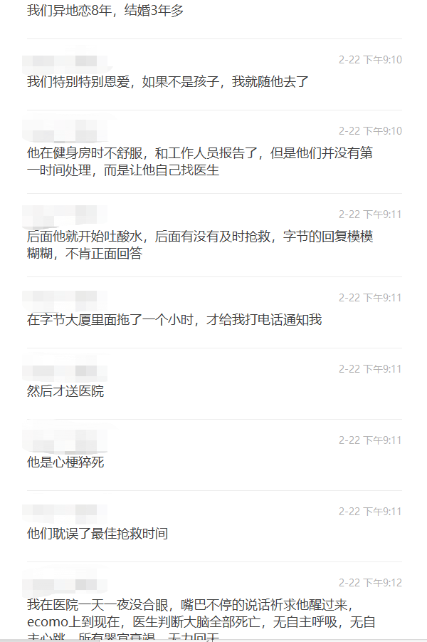 她在群聊中自述,吴同学在健身房时不舒服,和工作人员报告了,但是他们并没有第一时间处理,而是让他自己找医生。吴同学开始吐酸水后,有没有及时进行抢救,对此字节的回复模模糊糊,并未正面回复。“在字节大厦里面拖了一个小时,才给我打电话通知我。后面才送医院。”她还表示。