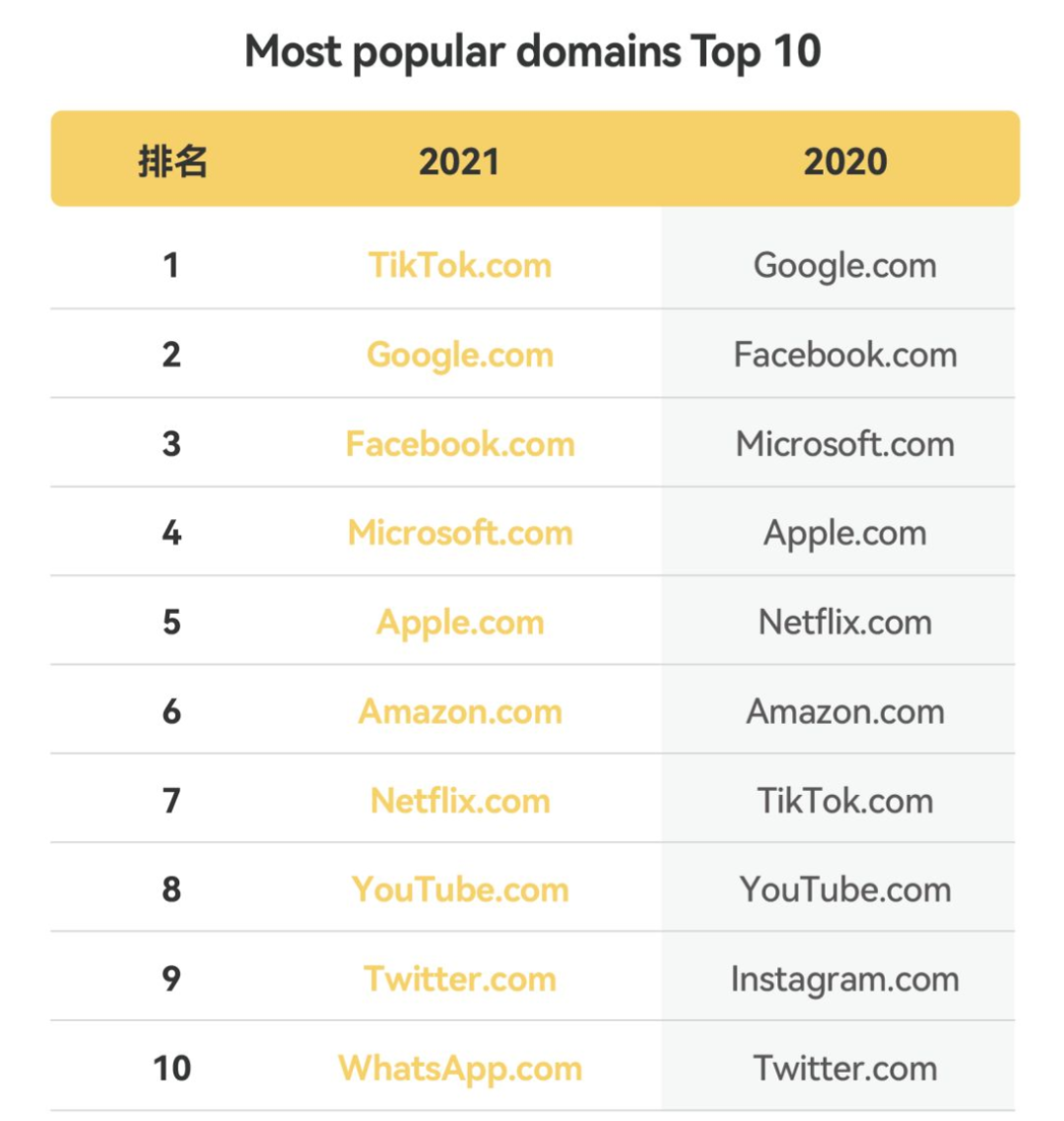 以字节跳动的TikTok为例,作为第一款真正意义上实现全球化的中国互联网产品,根据美国云网络安全服务公司发布的最新数据显示,2021年,TikTok已取代Google,成为全球流量最大的互联网产品。
