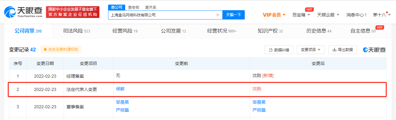 天眼查App显示,2月23日,上海盒马网络科技有限公司发生工商变更,法定代表人由侯毅变更为沈刚。该公司成立于2015年6月,注册资本约6.49亿人民币,经营范围含食品经营、酒类经营等。