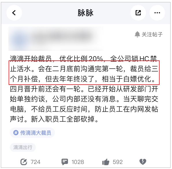 据报道,滴滴几乎全线业务都开始裁员,各部门裁员比例不一,总体裁员比例约为20%。而据招股书披露,截至2021年5月底,滴滴共有15914名全职员工。若按此数据推算,滴滴本轮裁员数量将在3000人以上。不难看出,滴滴此次裁员属于“全线裁员”,范围更大,程度更深,其目的也由“降本增效”转向了“弃车保帅”。