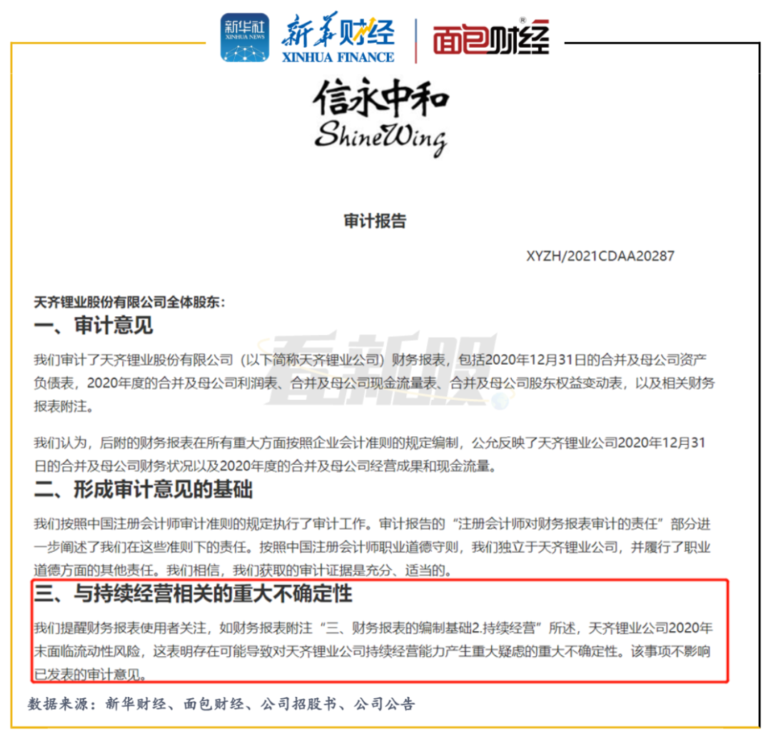 天齐锂业的审计师信永中和在2019年和2020年出具的审计报告中,均提及公司“面临流动性风险,这表明存在可能导致对天齐锂业公司持续经营能力产生重大疑虑的重大不确定性”。