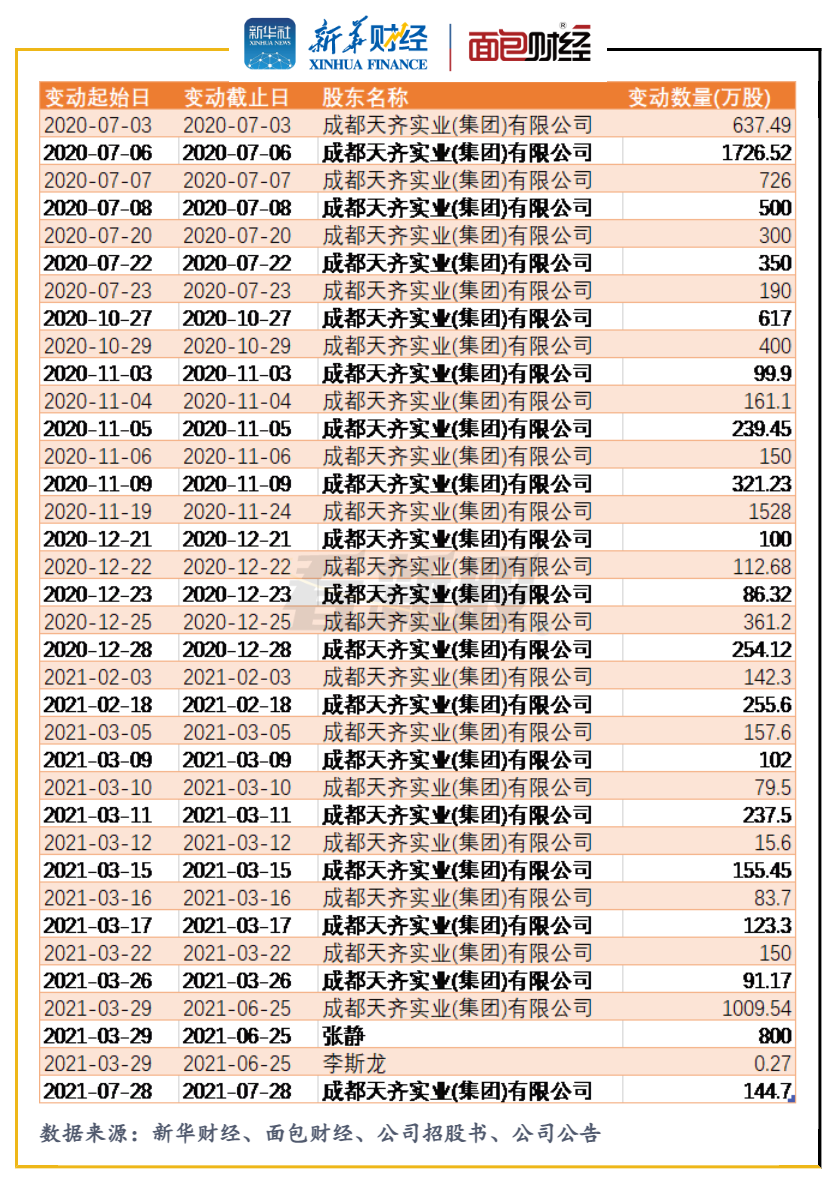 数据显示,2020年7月至12月,天齐集团通过集合竞价和大宗交易,合计减持约8861万股公司股份,合计减持金额超16亿元;2021年1月,天齐集团及其一致行动人张静、李斯龙发布减持计划,至当年7月29日减持计划实施完成,上述三位股东合计减持约3548万股公司股份,合计套现超18亿元。