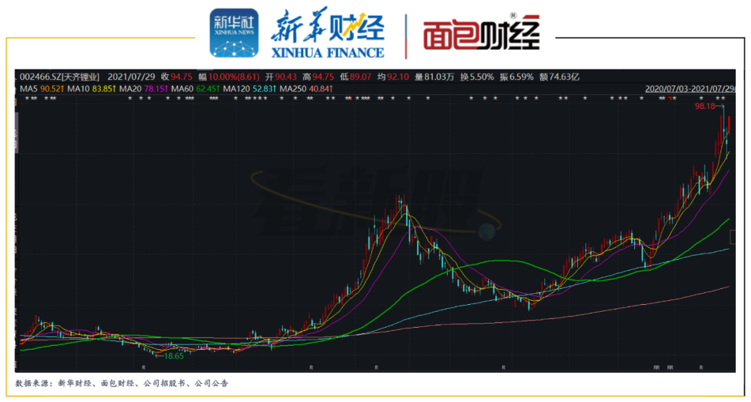 图9:2020年7月至2021年7月天齐锂业前复权股价