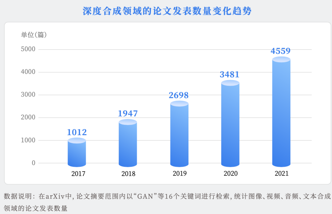 相关数据显示,2017年以来深度合成领域的论文数量正持续增长。其中针对图像类生成视频的研究占比最高,达到64%,音频和文本占比分别为12%和24%。