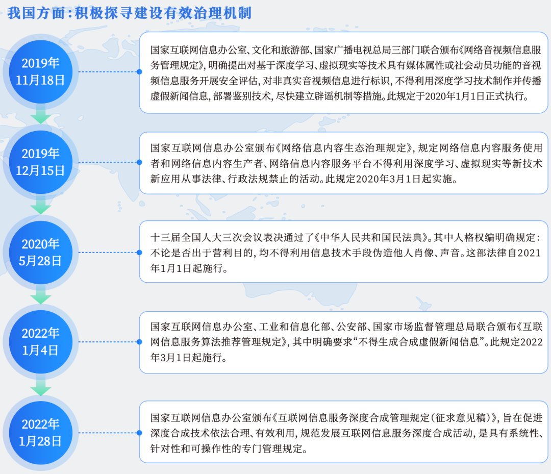 《报告》显示,除了发展深度伪造内容检测技术以外,近几年来,针对深度合成技术恶意使用所带来的挑战,世界各国纷纷出台相关法律法规,探索深度合成的治理路径。