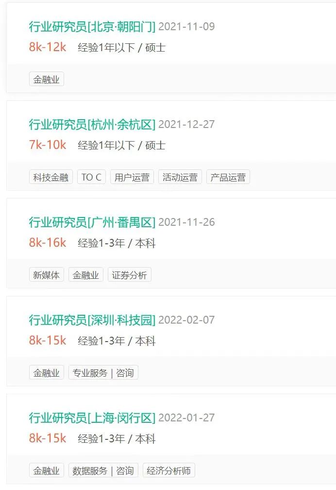 而在拉勾上搜索“行业研究员”,框选1-3年经验,结果显示8-15K每月是主要薪酬区间。