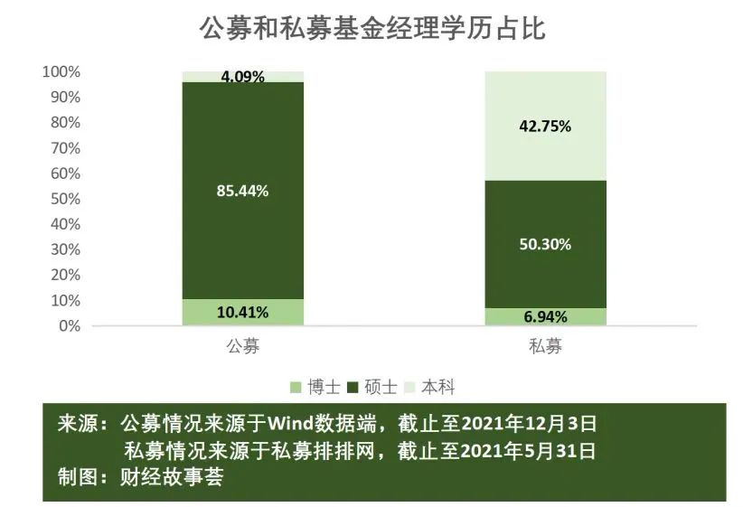 公募基金经理的高学历毋庸置疑,万德数据显示,截止至2021年12月3日,全市场共有2815名公募基金经理,硕士比例高达85.43%;而私募基金经理硕士占比仅为50.3%。