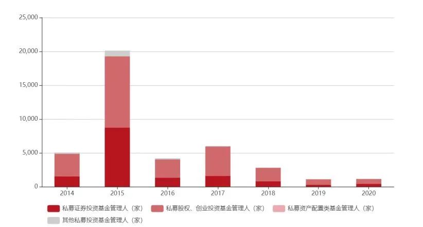 数据也可以佐证,中国证券投资基金业协会数据显示,2014年分类型私募基金管理人通过数量仅为5064家,到了2015年这个数据就达到了顶峰的20115家;当时,在杠杆的加持下牛市如火如荼,大量私募机构没有意识到风险,赌性十足在牛市顶部建了仓。