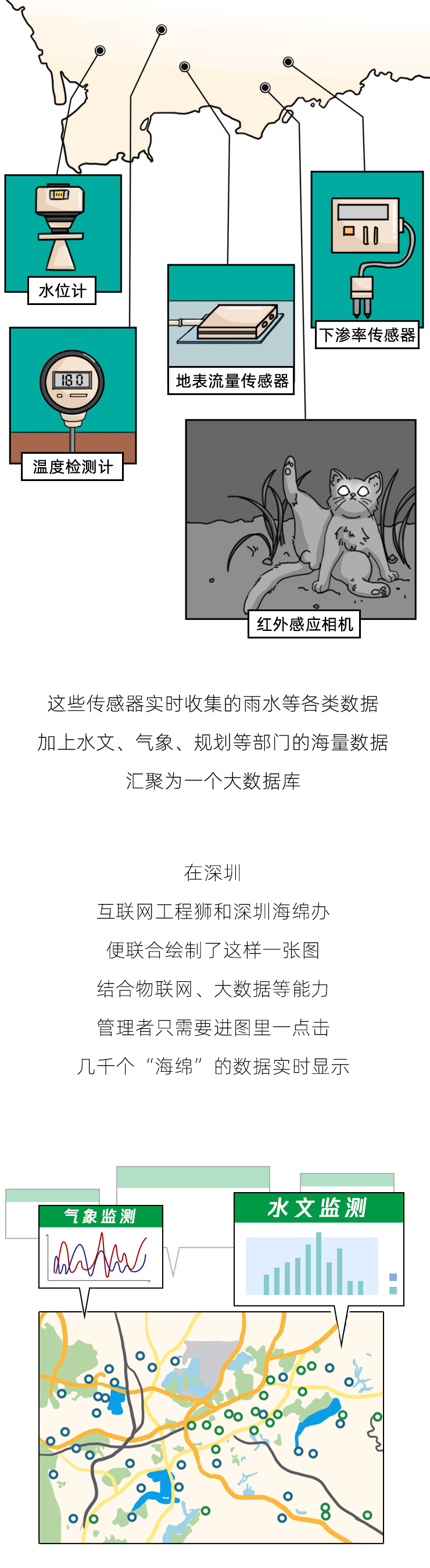 本期讲述的海绵城市,又被称为“水弹性城市”,它可以让城市像海绵一样,弹性调节雨水的影响。而在海绵城市管理系统的辅助下,可以让“海绵”数据得到实时显示,帮市政部门提前预警和科学决策。