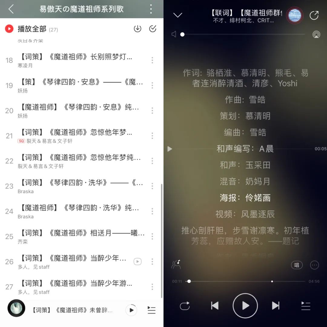 比如,词作“易者连消醉清酒”(圈名,以下简称“易者”,微博信息1997年生),她的出圈之作是2019-2020年网络热剧《陈情令》中魏无羡角色歌词《曲尽陈情》。