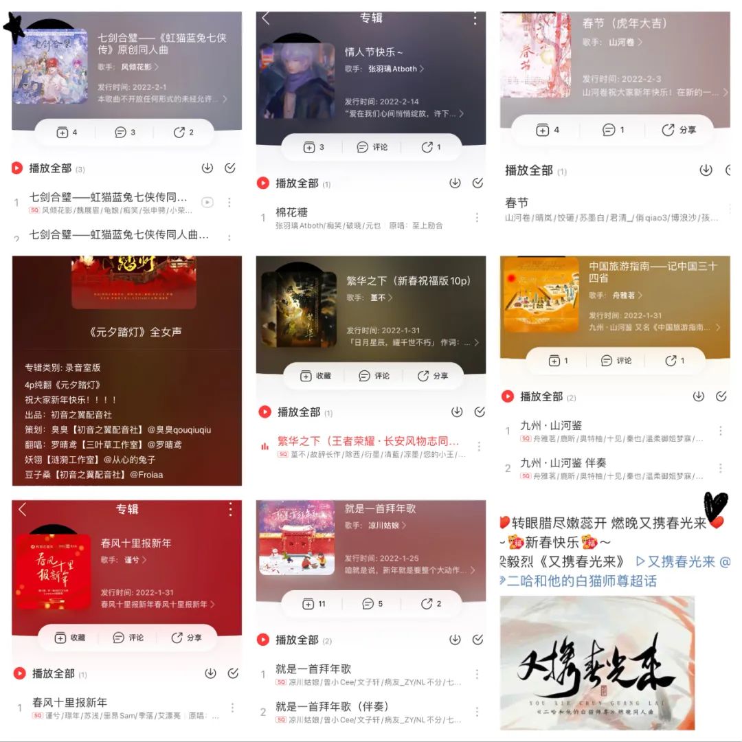 在刚刚过去的春节和元宵节期间,不少栖息在ACG(卡通、漫画、游戏)世界中的Z世代音乐人,跟其他人过节要约饭一样,就相互约起、“产粮”共创,在特别的日子发了不少同人歌曲。